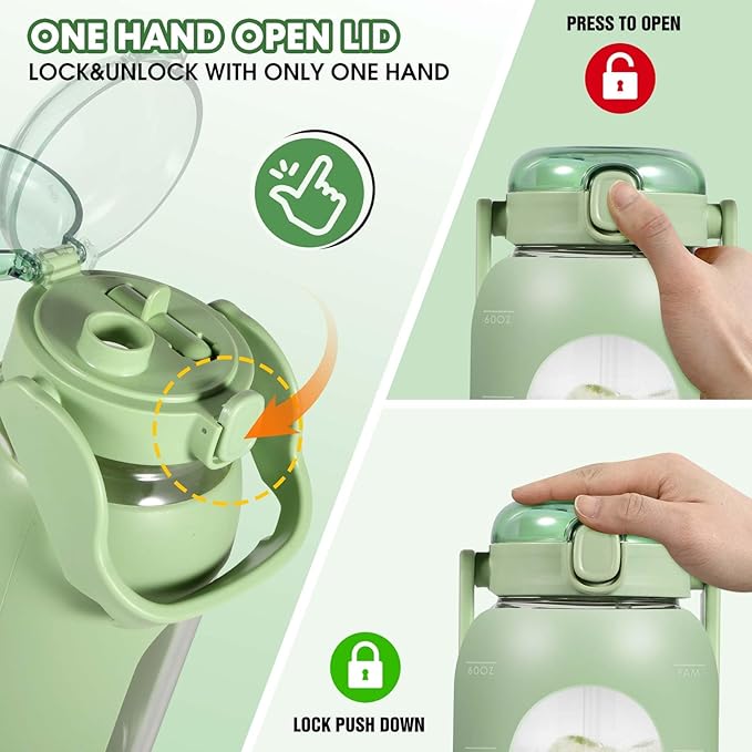 - Versatile Hydration-Friendly Design: Our timed water bottle features a unique dual-mouth lid, allowing you to switch drinking options between spout and straw anytime, anywhere. Say goodbye to constant lid changes. The press-and-push button lid design enables easy one-handed and leak-proof drinking.