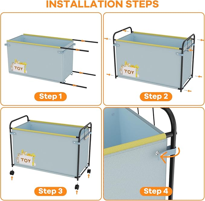 - EASY ASSEMBLY: Our rolling toy box can be quickly assembled without any hassle. The Oxford bag can be disassembled for cleaning, while the iron frame with bottom wheel design can lift the box to prevent moisture and dirt from accumulating