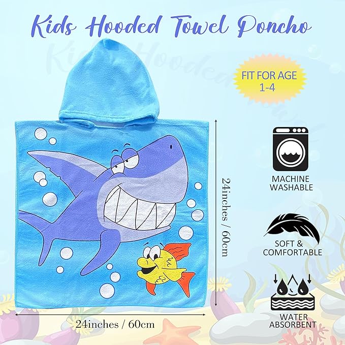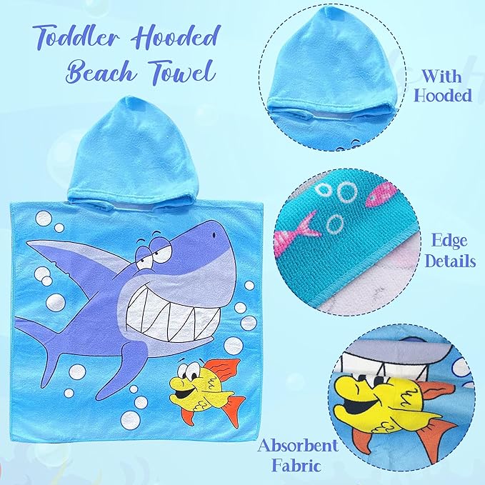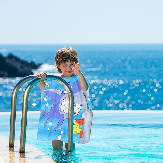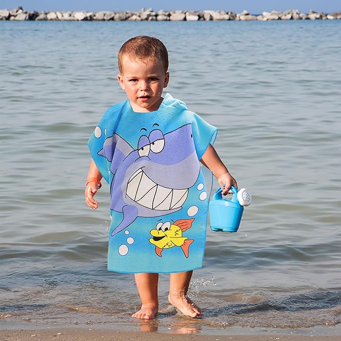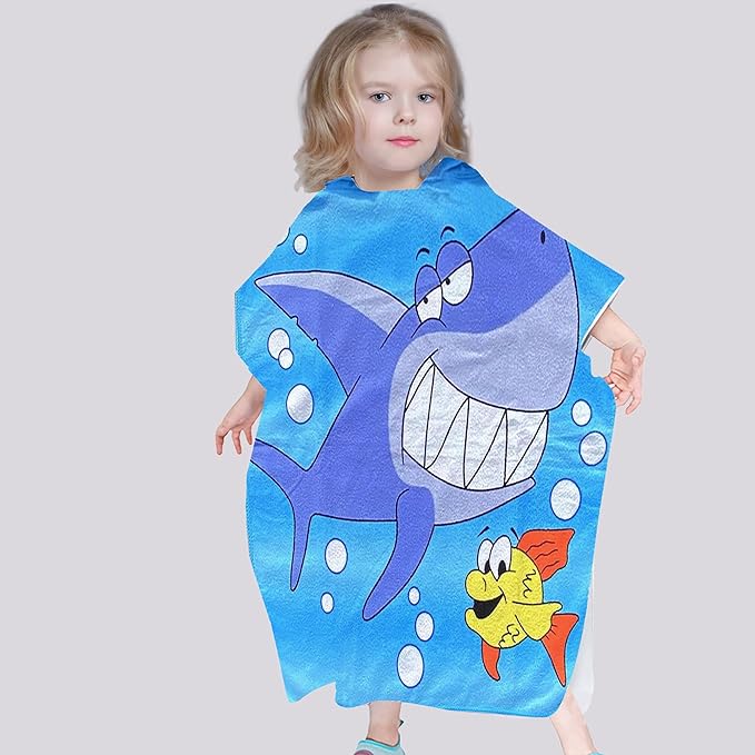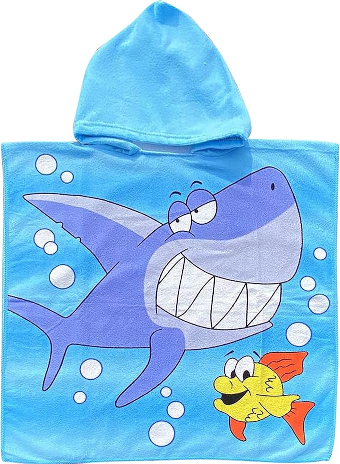- CARTOON SHARK AND FISH: This kid hooded towel printing with shark and fish. The classic pattern keeps this beach towel stylish, while the adorable fish and shark adds to its appeal, instantly winning the love of children! The cartoon suit for boys and girls, making your child stand out at the beach or pool.