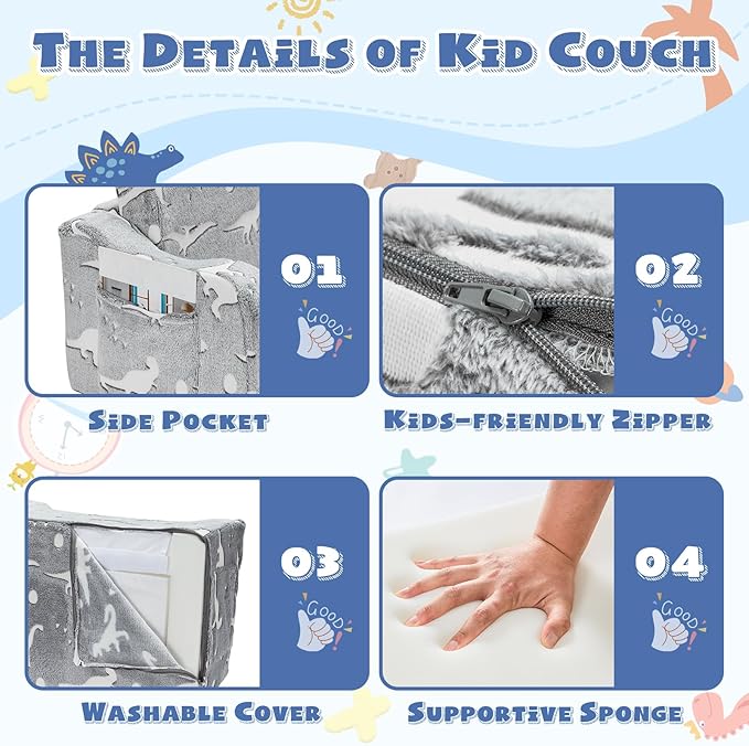 - GLOW IN THE DARK: Let your child's imagination take flight with our versatile toddler couch fold out, just put it in the sun (like charge the glow) or kept in the light for 3-5 hours, and partial pattern glows beautifully in the dark, creating a unique and cozy atmosphere. Perfect for reading, TV watching, or kicking back for family time,etc