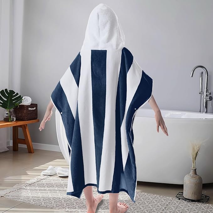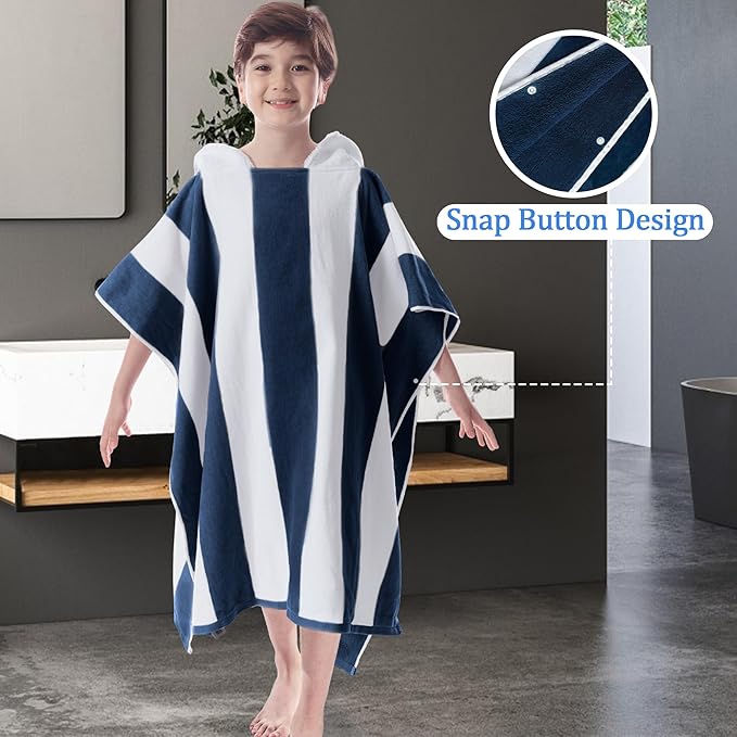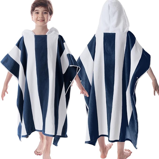 VOOVA & MOVAS Hooded Towel Poncho for Boys| Girls | Teens (8-16Years), 100% Cotton Thick Poncho Towel Robe for Kids, Perfect for Pool, Beach, Bath and Gifts, Navy White Stripe
