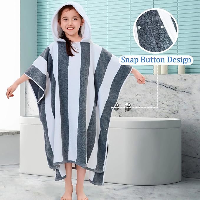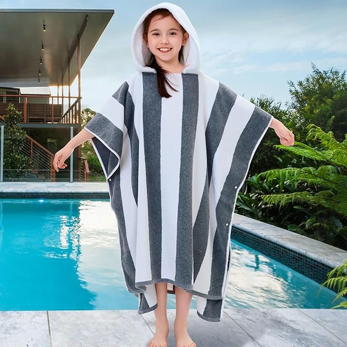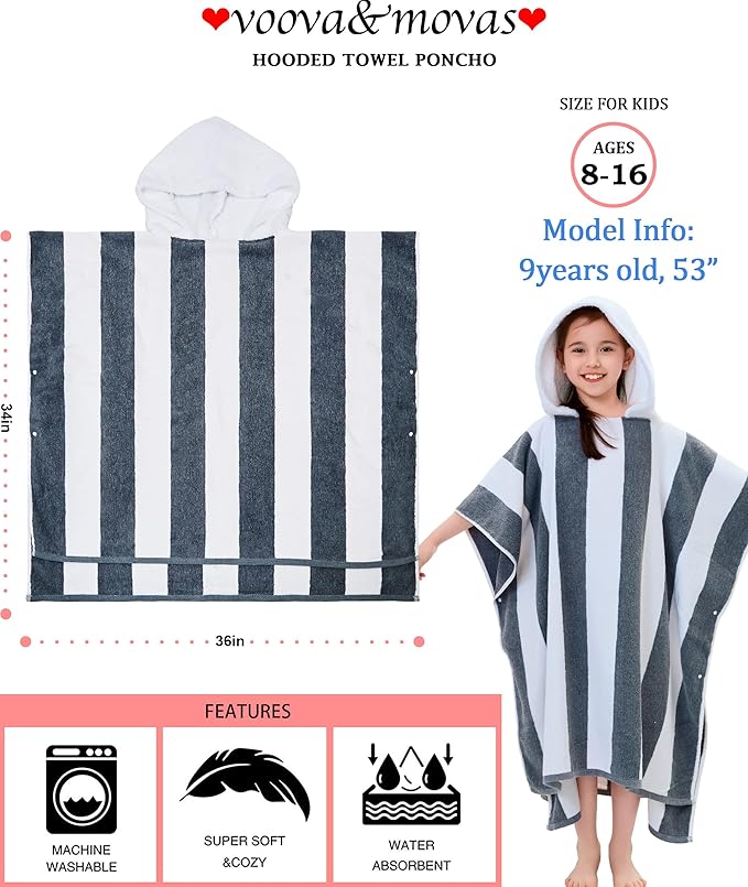 VOOVA & MOVAS Quick Dry Hooded Poncho Towel for Teens (8-16Years), 100% Cotton Thick Poncho Towel Robe for Kids | Boys, Perfect for Pool, Beach, Bath and Gifts, Gray White Stripe