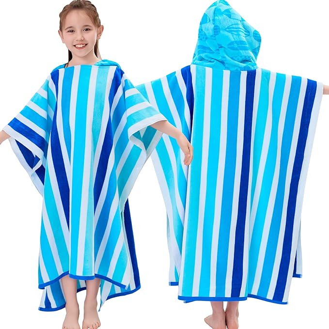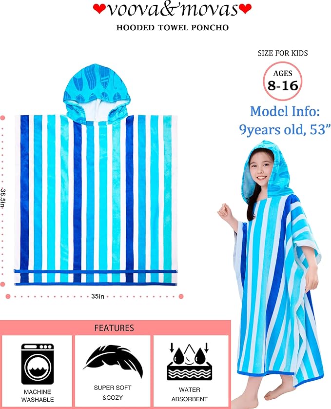 VOOVA & MOVAS Teens Poncho Towel with Hood (8-16Years), 100% Cotton Thick Poncho Towel Robe for Teens, Perfect for Pool, Beach, Bath and Gifts,Blue Stripe