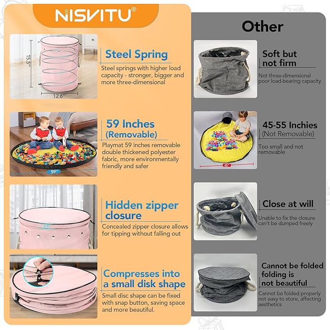 - Plenty of Space:Our kids toy organizer measures 15.5 inches tall and 12.6 inches in diameter, comes with a roomy 59-inch diameter play mat, has fenced edges to prevent toys from scattering, and can hold up to 11 gallons of toys. When the foldable storage box is not in use, the entire storage basket can be compressed into a small round cake that can be fixed with snap buttons. It is small and easy to store,hidden zipper is more beautiful.