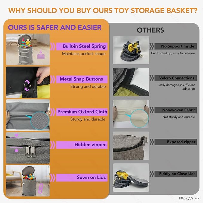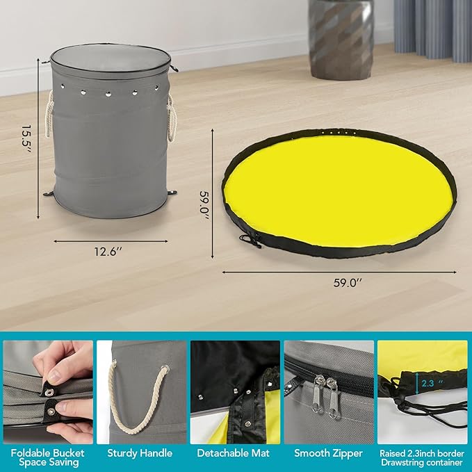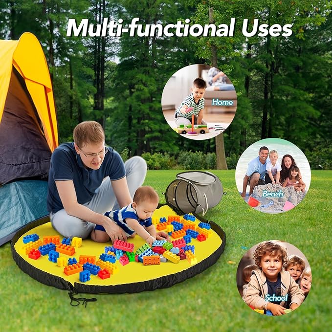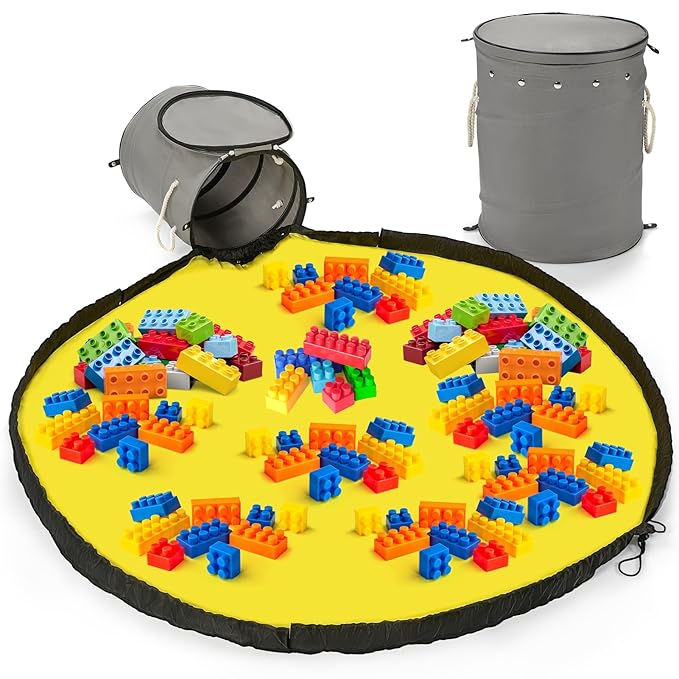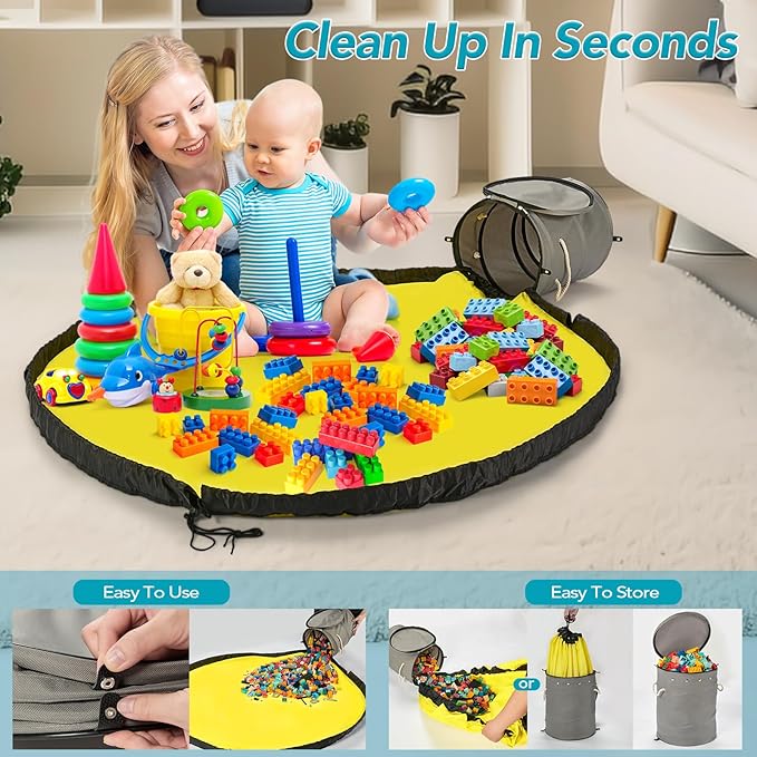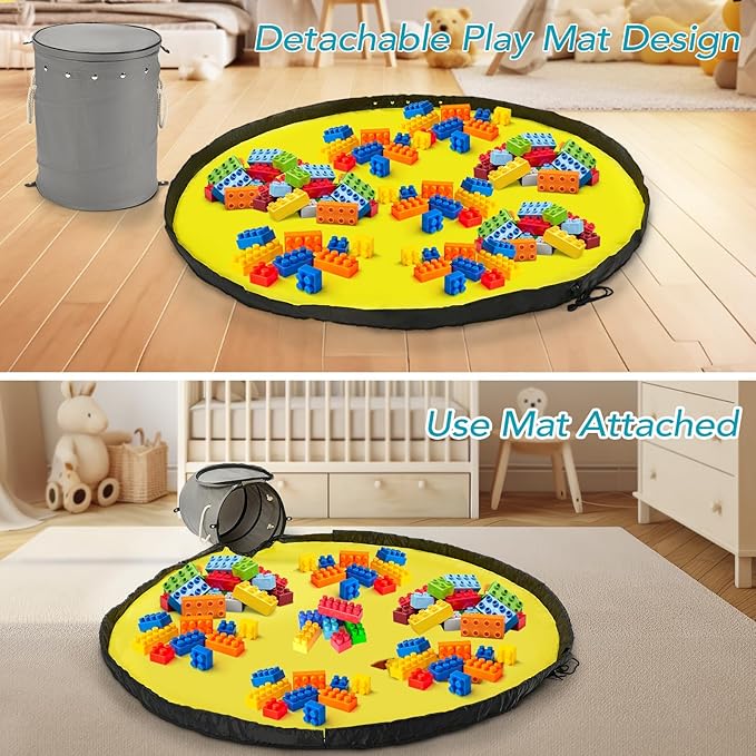 - 2-in-1 Toy Storage Solution - This toy storage basket and play mat effortlessly store and organize your children's building blocks and small toys. There are two ways to store toys, first is all-in-one storage, when it's time to clean up, simply pull the play mat drawstring to slide everything back into the storage bins with lids, and second is a separate storage, simply pull the detachable play mat drawstrings and all toys are packed, then place the storage mat bag into the toy organizer basket