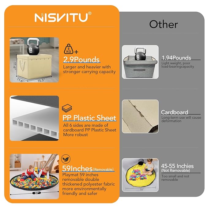 - Sturdy and Durable:The big storage bins with lids is made of washable thickened Oxford cloth + PP plastic board, and the Play mat is made of thickened polyester cloth. No abnormal odor.The 6 sides of the storage bins for toys are made of PP plastic sheets, making it stronger. The handle of the toy chest is made of high-quality soft hemp rope, which allows you to move the large toy box at will.