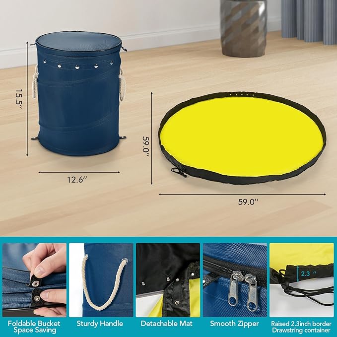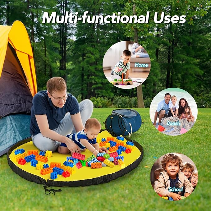 - Clean-up in Seconds - This combo toy storage organizer and play mat are easy to clean and use. When it's time to pack up, simply pull the drawstring of the mat to slide the toy cars, dolls, and building blocks back into the toy storage bucket. Its foldable structure allows easy stacking and storage when not in use, making the most of your living space with our organizers and storage solutions