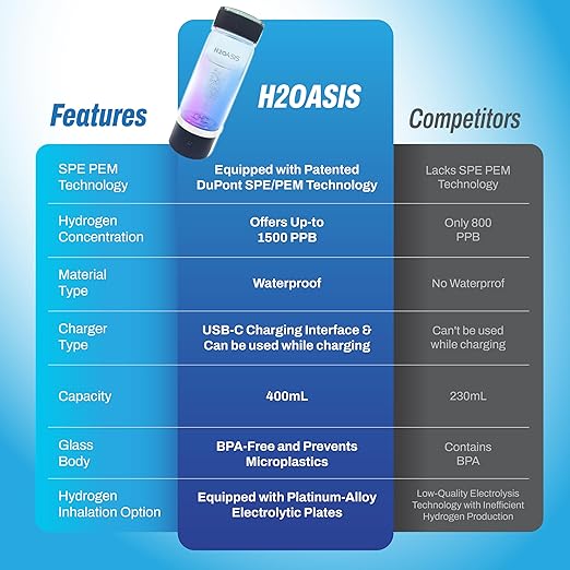 - Advanced SPE PEM Technology: The H2OASIS Hydrogen Water Bottle comes with patented SPE PEM technology from DuPont, H2 production up to 1500 PPB without residual pollutants like chlorine and ozone.