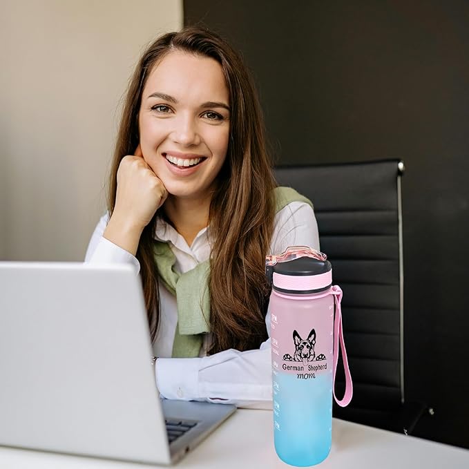 German Shepherd Mom Water Bottle with Straw, Carry Strap, LeakProof, Tritan BPA Free, 32 Oz Motivational Water Bottle with Time Marker to Drink Enough Water for Gym Fitness Outdoor