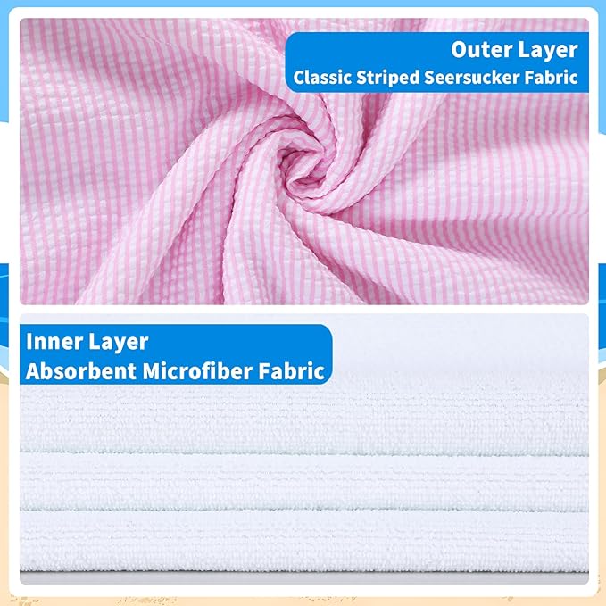 - 【SEERSUCKER + MICROFIBERi BEACH TOWEL】:Our hooded beach bath towel is made of two layers, an absorbent microfiber inner layer and Classic striped seersucker outer layer.In addition to being used as a bath towel, it can be used as a daily wear for children in hot summer.
