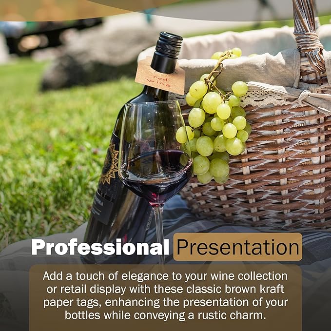 - ✔【Convenient Design】: These kraft paper tags are designed with practicality in mind. These wine bottle tags feature a 1.1-inch hole that easily slides onto the neck of standard wine bottles. The compact size (2¼ x 3½ inches) offers just the right amount of space for labeling. Plus, the neutral brown color complements any wine bottle or decor scheme.
