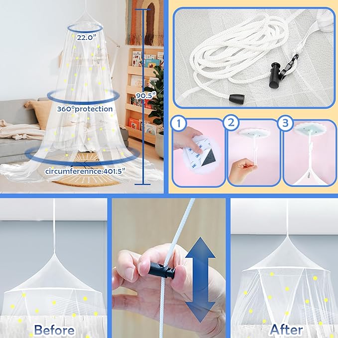 - 【Adjustable and Easy Setup】 - With top dimensions of 56 cm in diameter x 1020 cm around base x 230 cm height (approx. 22” x 402” x91”), our canopy come with an adhesive-backed hook for easy installation and is suited for twin, full, and queen bed sizes; Additionally, we also provide an extension cord, allowing you to adjust the canopy to perfectly match the size of your bed based on the height of your ceiling