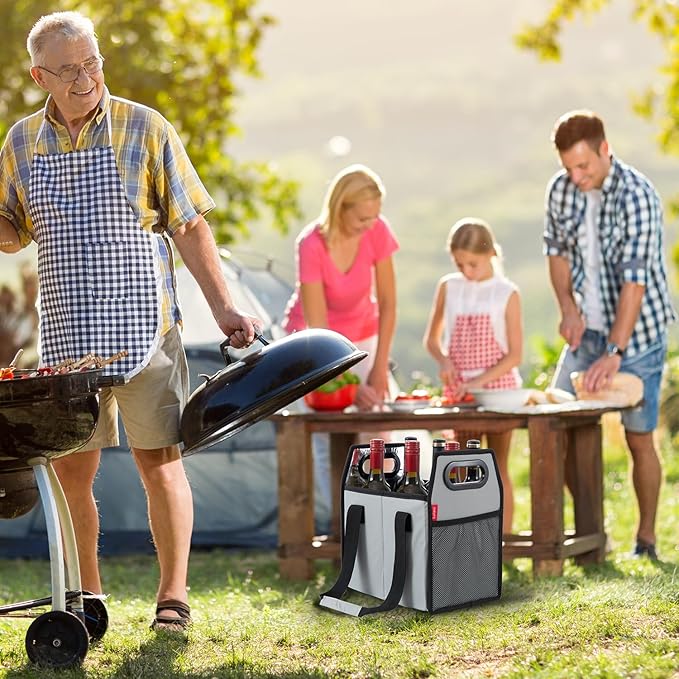 - REMOVABLE DIVIDE DESIGN:Well padded with internal divider for 6 bottles. The separator in the bag is a nice touch to stop bottles hitting against one another,Bottle holder is a safe, hassle-free solution for carrying your favorite beverages and their storage,Great for transporting wine to parties, wine dinners, restaurants, pool or beach parties, picnics, concerts and sporting events.