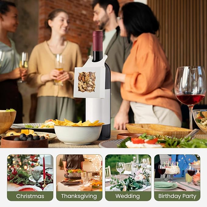 - UNIVERSAL SIZE - Wine bottle hanging boxes are 3.5 x 3.5 x 1.2 inches / 9 x 9 x 3 cm in size, and the hanging hole size is 1.5in / 3.8cm. Thick kraft paper material makes candy box with window durable and easily to hang on various size glass bottles such as champagne ,prosecco, beers, and also plastic bottles like soda and water bottle.