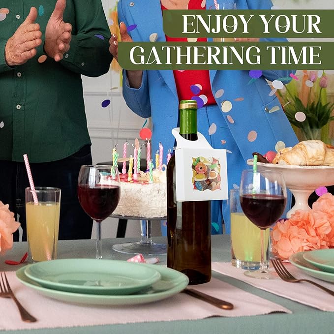 - UNIVERSAL SIZE - Wine bottle hanging boxes are 3.5 x 3.5 x 1.2 inches / 9 x 9 x 3 cm in size, and the hanging hole size is 1.5in / 3.8cm. Thick kraft paper material makes candy box with window durable and easily to hang on various size glass bottles such as champagne ,prosecco, beers, and also plastic bottles like soda and water bottle.