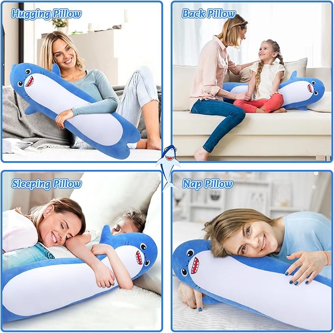 - 【Multi Functional Long Shark Plush Pillow】It can be a waist cushion or pillow on the sofa, a sleeping pillow or companion during room rest, or a temporary cushion for playing and resting. It is both full and elastic. Squeezing it can relieve stress and negative emotions in work and life, accompany you through lonely times, and add some fun and comfort. This will be the perfect gift for Christmas, Thanksgiving, Valentine's Day, Halloween, Mother's Day, Father's Day, and birthday holidays. Your friends, family, and loved ones will all love it very much.