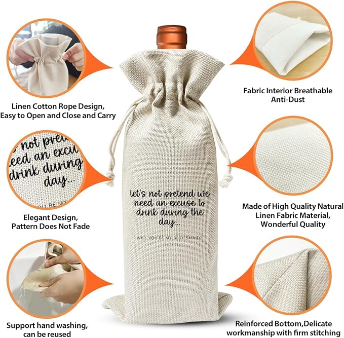 - PREMIUM MATERIAL: Our funny Bridesmaid to be wine bag is made of high-quality cotton linen material fabric, printed double-sided, odorless, smooth appearance, durable and reusable. At the same time, it has very good quality and safe enough to protect or hold wine or champagne bottle.