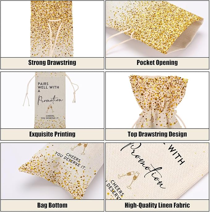 - Perfect Design And Size: Our wine bottle gift bags are 14.2 x 5.5 inches, can hold red wine bottles or champagne bottles, drawstring design makes it easy for you to put in and take out the wine bottles. Tighten the drawstring to protect your bottle from exposure. Can enhance the elegance and novelty of supplies and decorations for various party occasions. This is a unique gift for men, women, mom, colleague, grandma, friend, sister, bride, bridesmaid, father, groom.