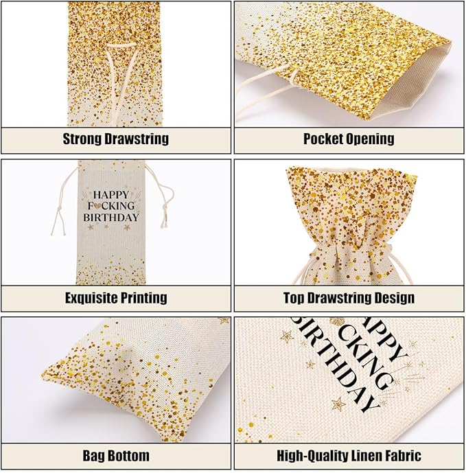 - Colorful Graphics And Text: Our wine bottle bag prints are clear and sleek with vibrant and eye-catching graphic text that adds a playful and celebratory element to any birthday party. An ideal gift for both men and women, this elegant wine bag combines beauty and functionality. Our wine bags are perfect for all kinds of important occasions, making the occasion more memorable and memorable.