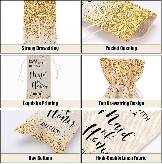 - Perfect Design And Size: Our wine bottle gift bags are 14.2 x 5.5 inches, can hold red wine bottles or champagne bottles, drawstring design makes it easy for you to put in and take out the wine bottles. Tighten the drawstring to protect your bottle from exposure. Can enhance the elegance and novelty of supplies and decorations for various party occasions. This is a unique gift for men, women, mom, colleague, grandma, friend, sister, bride, bridesmaid, father, groom.