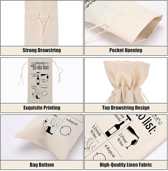 - Premium Material: Our wine gift bag is made of high-quality linen fabric, which is durable and reusable, reducing the impact on the environment. Good quality, strong support and safe enough to protect and hold wine or champagne. There is a drawstring design at the opening for easy opening.