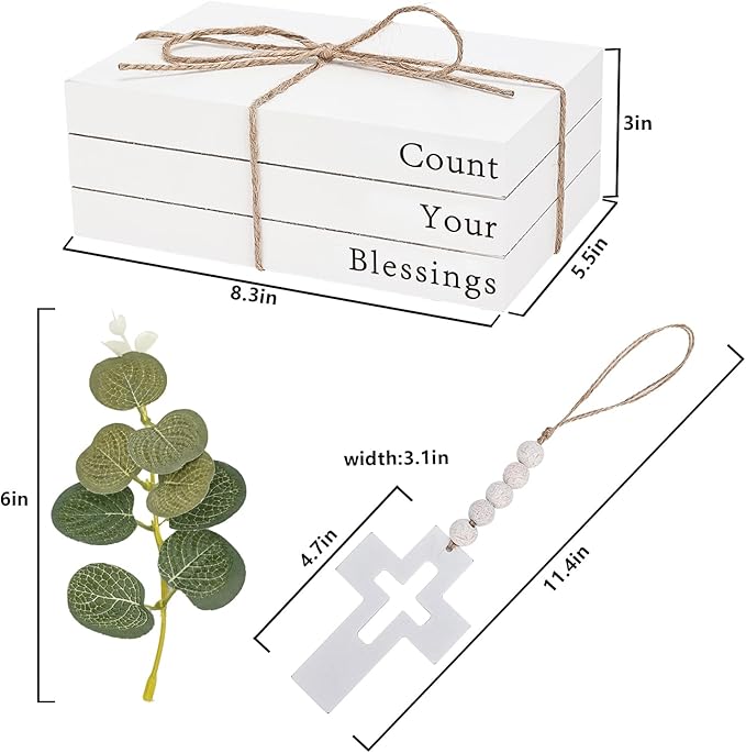 - PACKAGE: The package contains a set of wooden decorative books, wood bead garland with cross, and artificial eucalyptus leaves