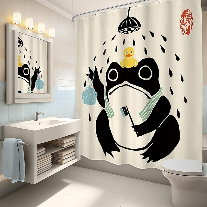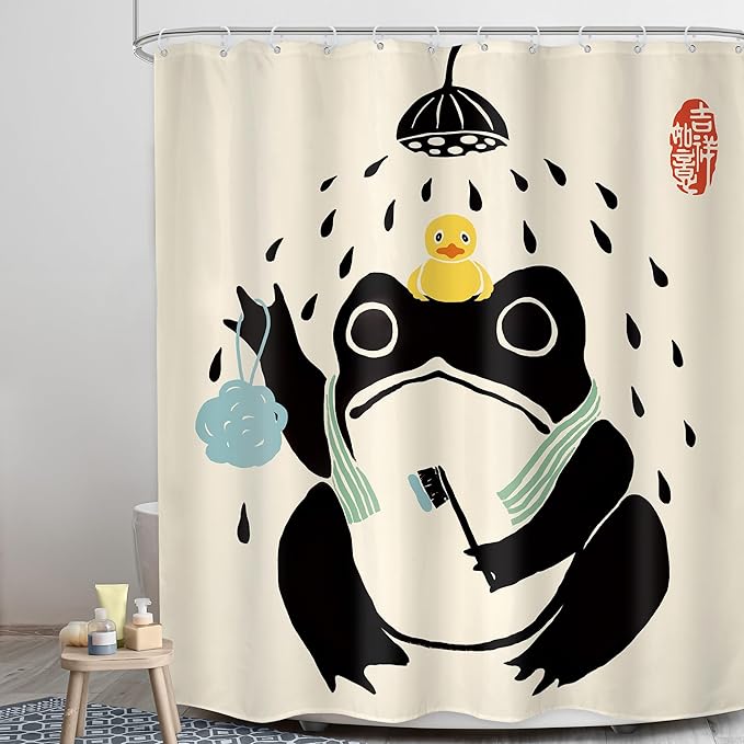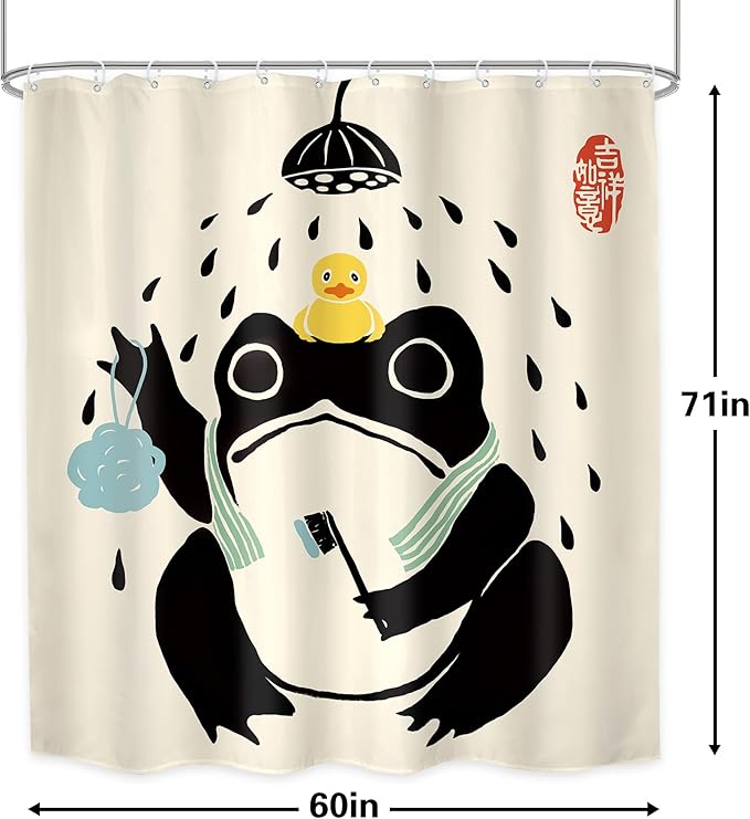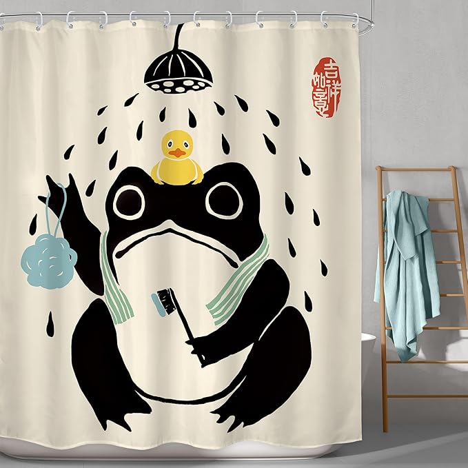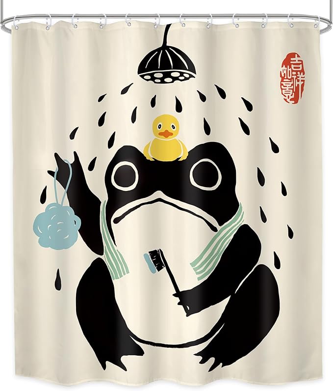 LGhtyro Funny Frog Shower Curtain Bathroom Set 60Wx71H Inches Cute Animal Bath Asian Style Traditional Japanese Art Rubber Duck Bath Accessories Retro Black Beige Art Home Decor Fabric 12 Pack Hooks