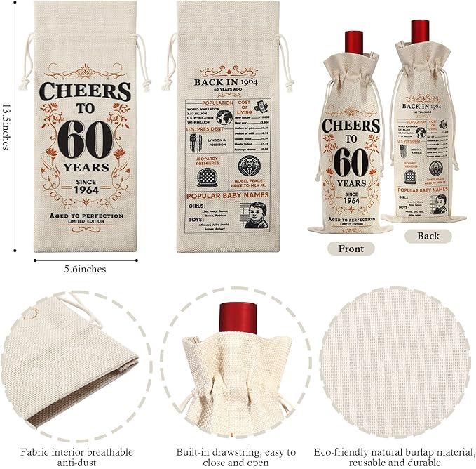 SpringWhisper 2Pcs 60th Birthday Gifts for Women Men Back in 1964 Birthday Gift 60 Years Old Gift Birthday Decoration Wine Bag Gift for Her Him Wine Gift Bag 60th Turning 60