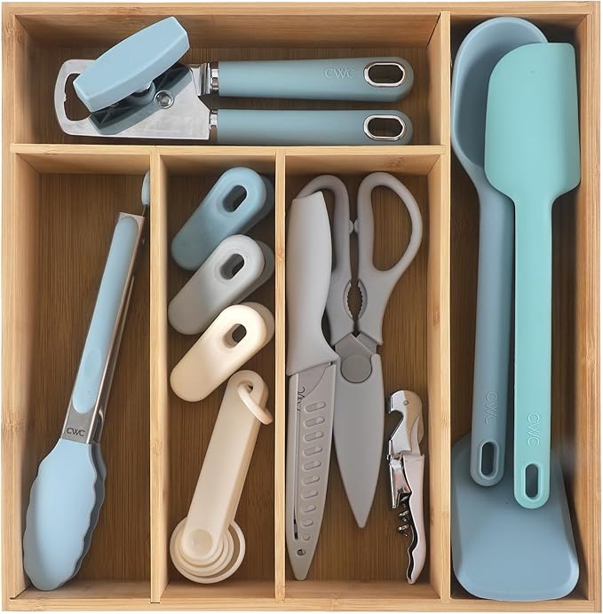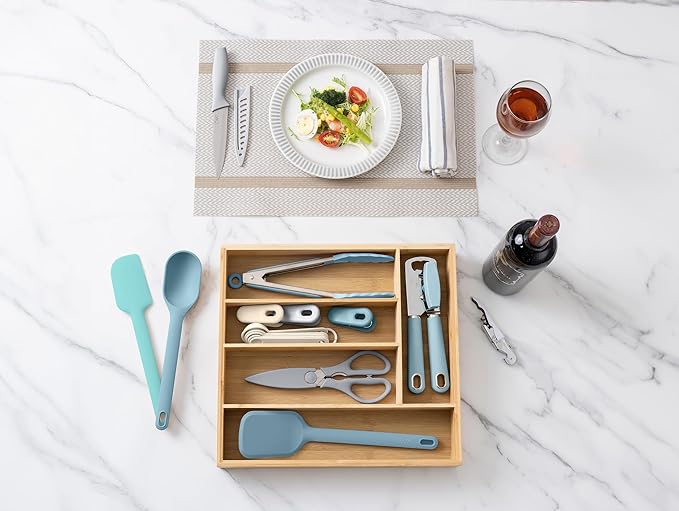 COOK WITH COLOR Bamboo Kitchen Utensil Set with Drawer Organizer | Cooking Tools and Storage Caddy, Blue, 18 Piece Gadget Set