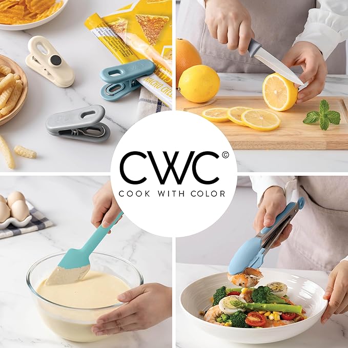 - Set Includes: 1 silicone turner, 1 silicone spoon, 1 silicone spatula, 1 pair of tongs, 1 can opener, 1 kitchen shears, 1- 5in knife, 1 can opener, measuring cups and 3 bag clips.