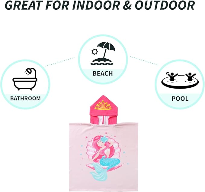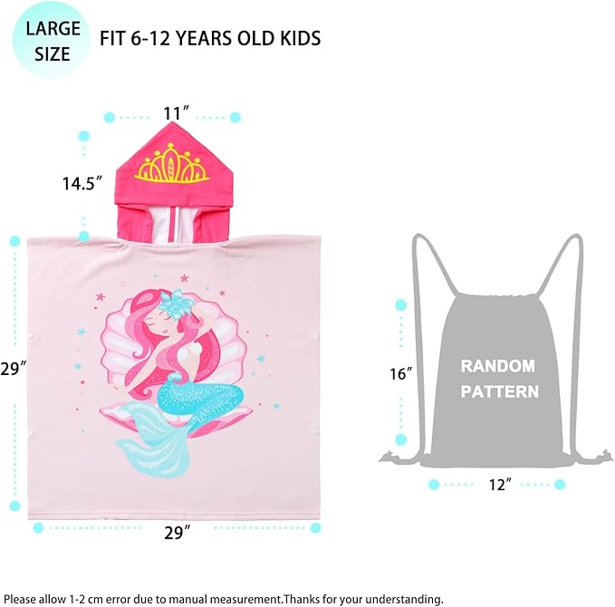 - SIZE: The kids hooded beach pool towel poncho measures 29.5"x29.5" in length with a 13.7x13.7" hood. This baby beach bath towels with hood is large enough for growing toddlers and kids(6-12 years old) or anyone under 60 inch girls boys.