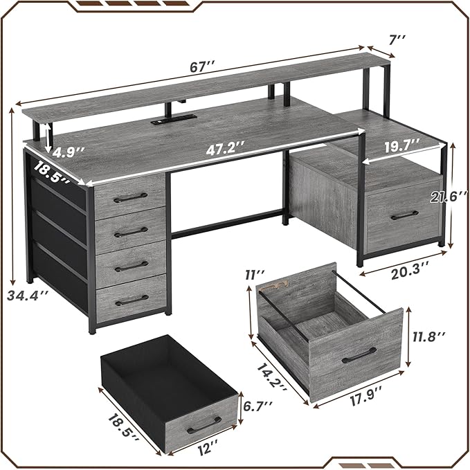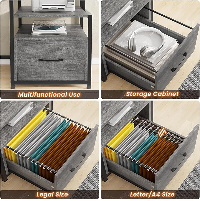 - 【4 Large Fabric Drawers and Wood File Drawer】Coming with a file drawer, fabric drawers, printer cabinet and open shelves with powerful storage space. File cabinet can hold letter/A4/legal files. This solid constructed computer desk could hold printers, scanners, fax machines and any other office machines, keeps printer or scanner within easy reach of your desk to free up work space.