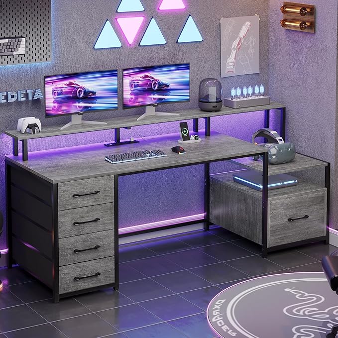 SEDETA Home Office Desk with File Drawer & Power Outlet, 66'' Computer Desk with 5 Drawer, Storage Shelves, Printer Cabinet and Monitor Shelf, Gaming Desk with Led Lights, Grey
