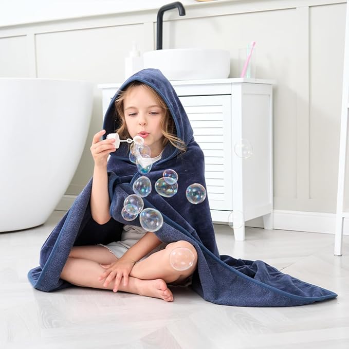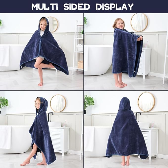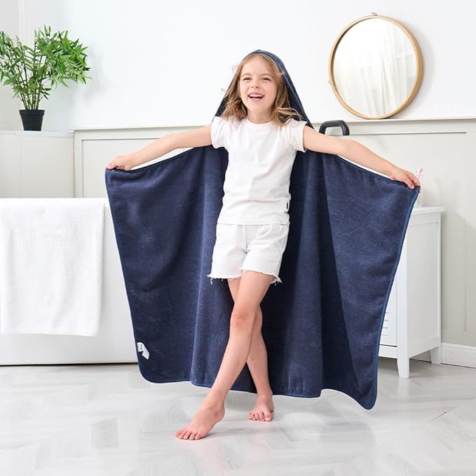 Hiturbo Kids Hooded Bath Towel: 100% Cotton Soft Thick Absorbent Towels Wrap - 50"x30" Shower Beach Pool Wearable Blanket for 3-12 Yrs Boys Girls - Navy Blue