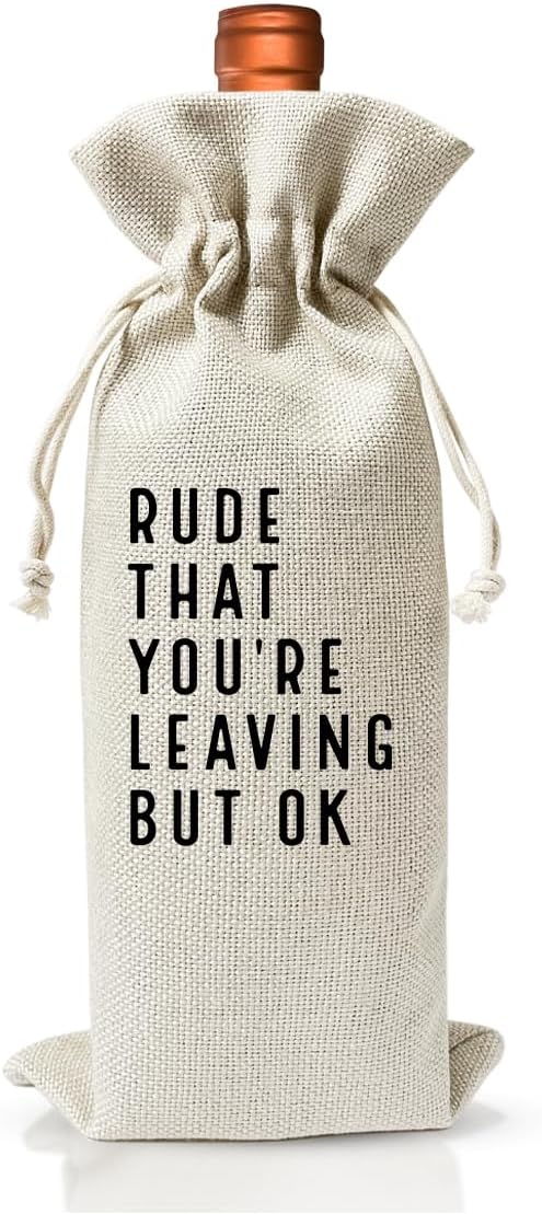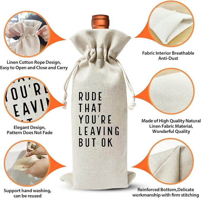 - PREMIUM MATERIAL: Our funny wine bag is made of high-quality cotton linen material fabric, printed double-sided, odorless, smooth appearance, durable and reusable. At the same time, it has very good quality and safe enough to protect or hold wine or champagne bottle.