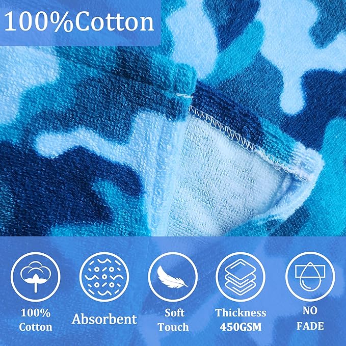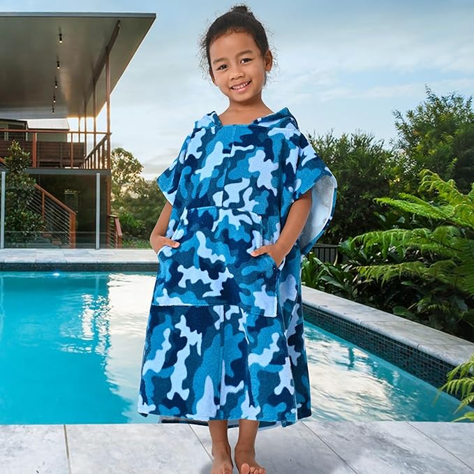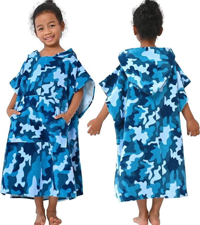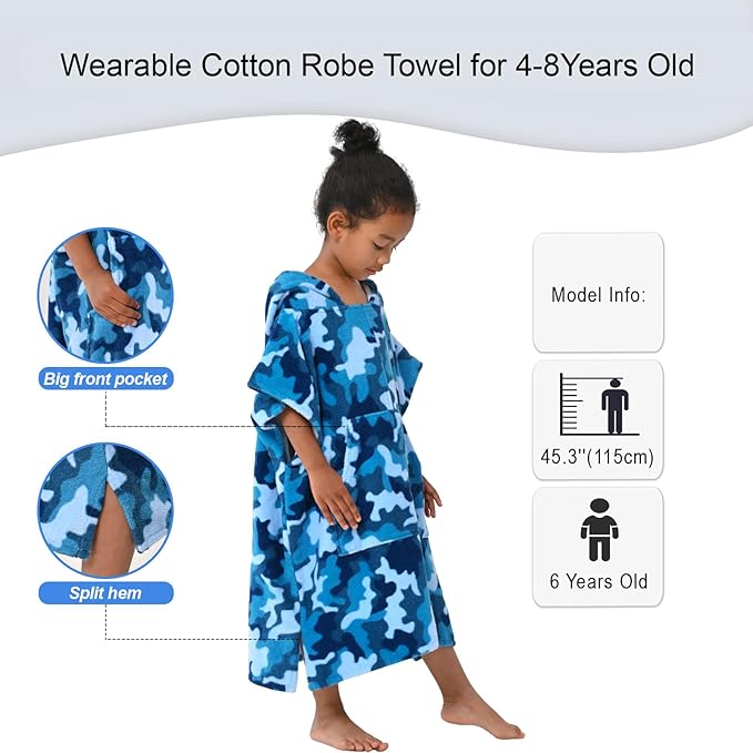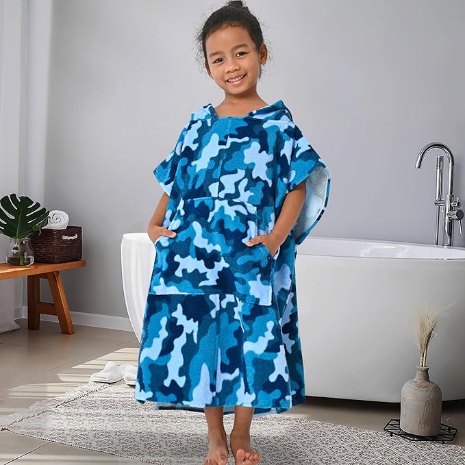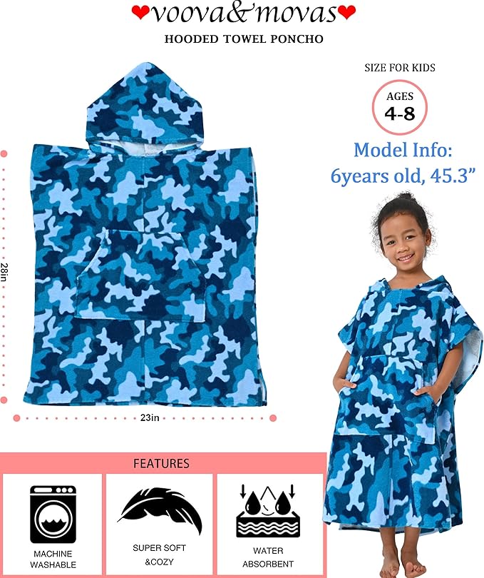 VOOVA & MOVAS Toddler Towels Robe, 4-8 Years, 100% Cotton Poncho Towel, Absorbent Thick Hooded Towel Dress for Boys | Girls,Surf Poncho for Pool | Beach | Bath | Swim, Blue Camo