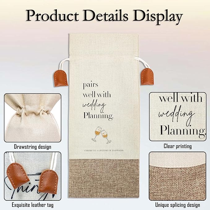 - The wine bag is designed with linen fabric splicing, which is simple yet exquisite. This wine bag features a drawstring design at the top, paired with exquisite leather tags to secure the bottle in place and add a touch of delicacy to your birthday, wedding, engagement, bridal showers, and celebration parties.