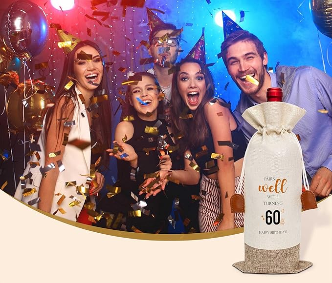 60th Birthday Wine Bag, Cotton Linen Wine Gift Bag With Drawstring, Wine Champagne Bottle Gift Bag, 60 Years Old Birthday Gifts for Woman Her Friend Sister, 60th Birthday Party Favors-29