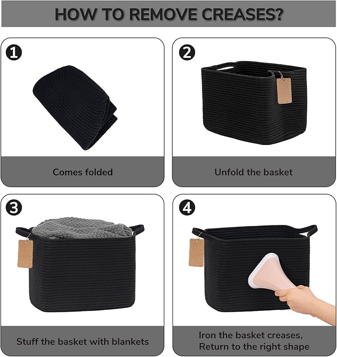 - Note: The rope basket is folded for transport, it will quickly turn back to its elegant shape when you fill it with some towels or clothes, an iron is also a good idea