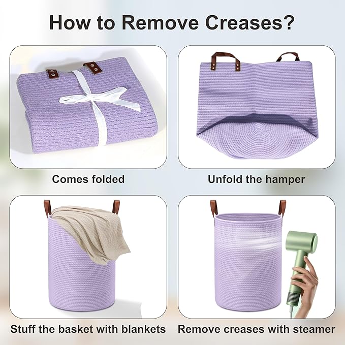 - Note: Laundry basket rope comes in a folded package and will have creases. You can use an iron to adjust the shape, or fill the rope blanket basket with blankets, clothes and wait for 1-2 days, which can help the rope basket to regain its shape