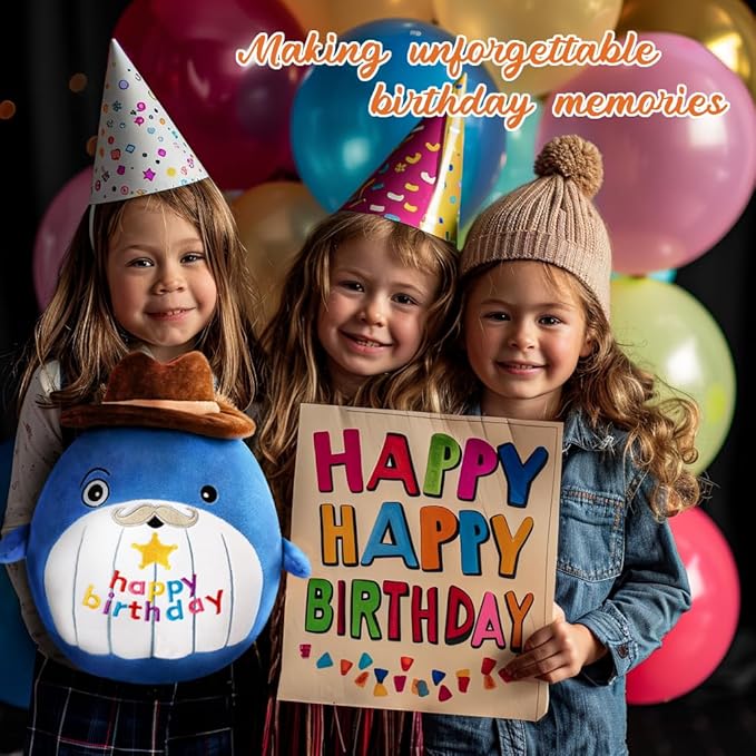 - ORIGINAL DESIGN: This Birthday Whale Plush Pillow is a Loren J Designer Original! The playful eyes, brown cowboy hat, and "Happy Birthday" embroidered on his belly are all elements that add to the unique charm of this birthday whale. Add the Birthday Whale Plush Pillow to your plush pillow collection!