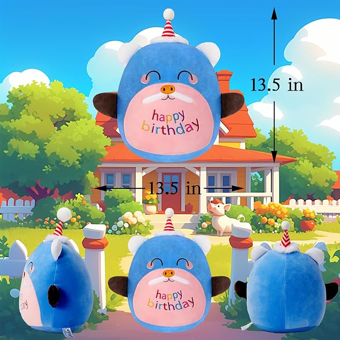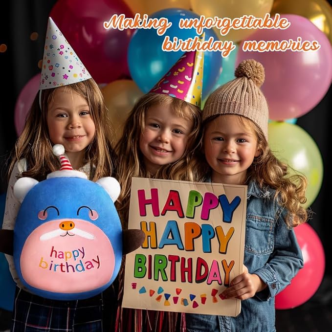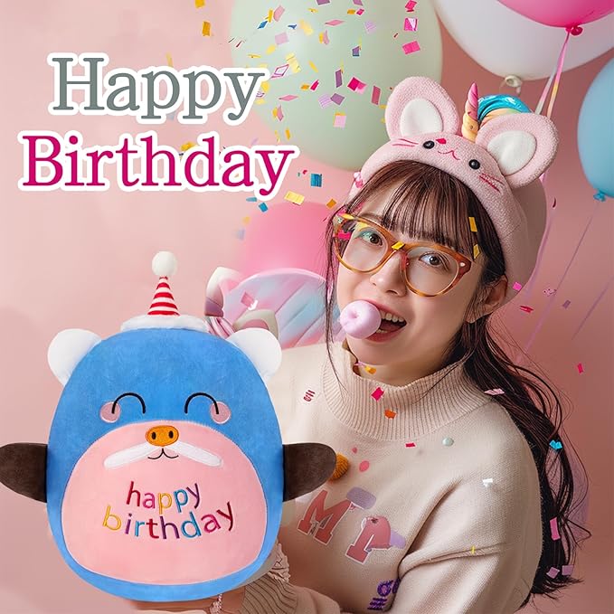 - đORIGINAL DESIGN: This Birthday Pig Plush Pillow is a Loren J Designer Original! A brightly colored birthday hat, smiling eyes that make you feel happy, and the words "Happy Birthday" embroidered on his belly are all elements that add to the unique charm of this birthday pig. Add the Birthday Pig Plush Pillow to your plush pillow collection!