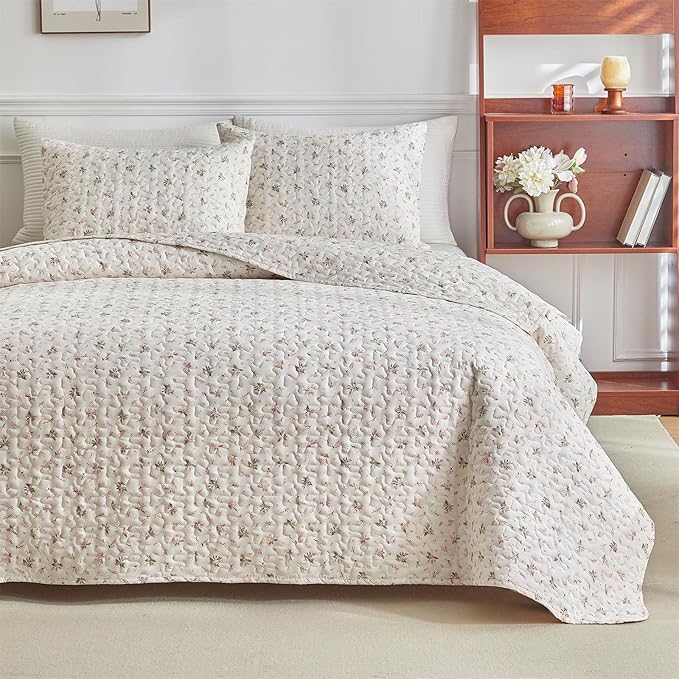 mixinni Floral Quilt Set Queen Cute Pink Flower Printed Quilted Bedding Set, Soft Aesthetic Floral Lightweight Bedspread Coverlet Set with Shams for All Season-(90"x96", 1 Quilt+ 2 Pillow Shams)