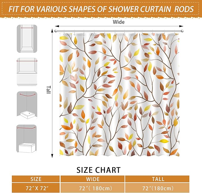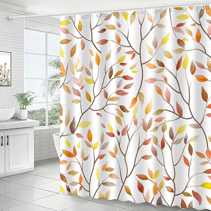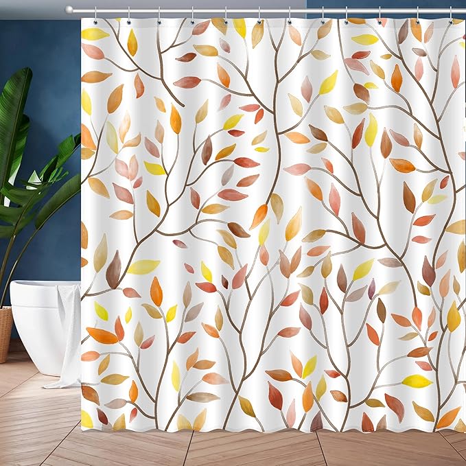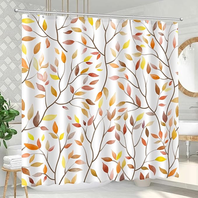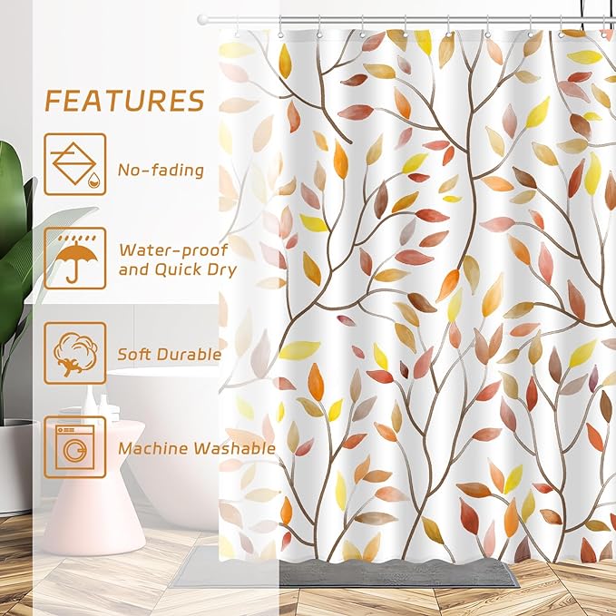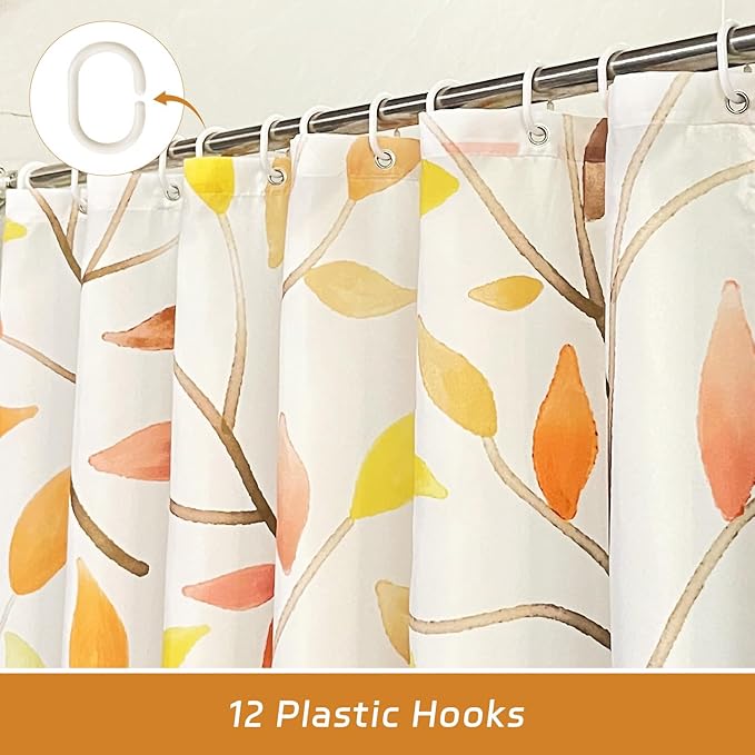 Boho Fall Shower Curtain, Autumn Colorful Botanical Flower Leaves Bohemian Yellow Fabric Shower Curtain Set with 12 Hooks, Bathroom Accessories Decor Cloth Curtain 72x72 Inches