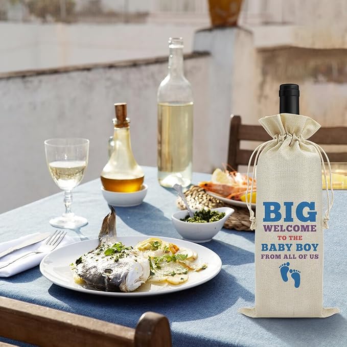 - Pregnancy Announcement Gift for Families: wine bags are double-sided printed which printed the text--"BIG WELCOME TO THE BABY BOY FROM ALL OF US"and can catch other's attention quickly. When your friends and family see the words on a wine bag they can realize you have a baby boy. It can make the entire baby gender reveal announcement process more surprising and interesting.