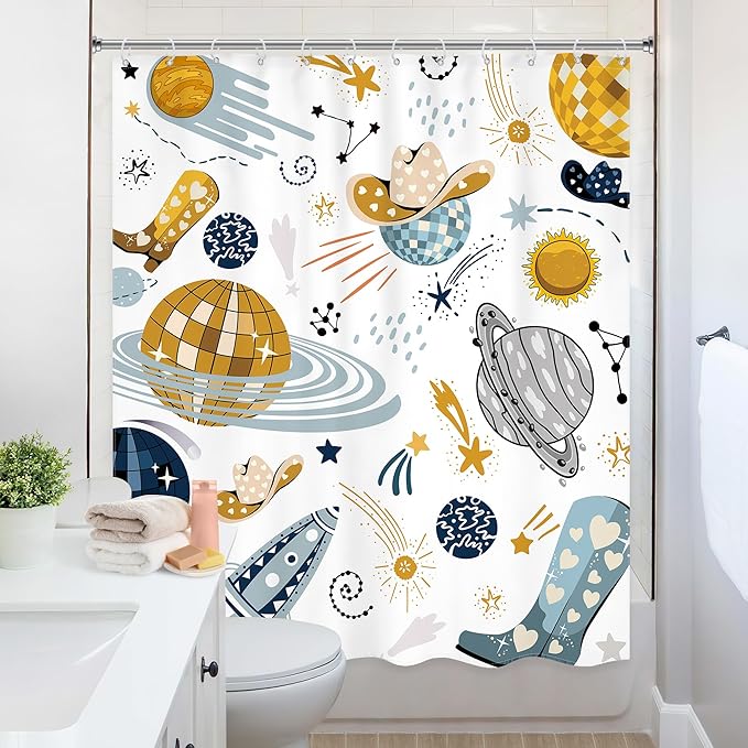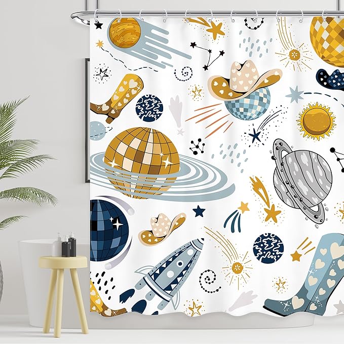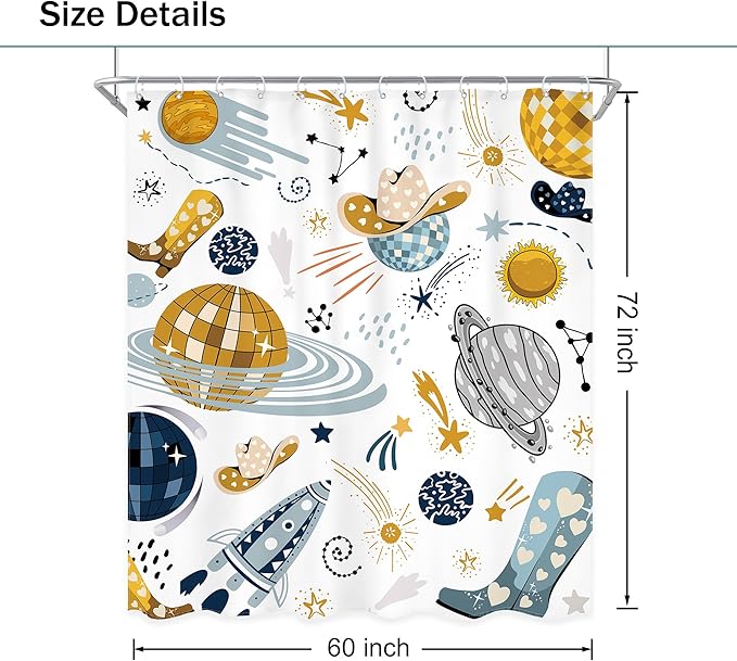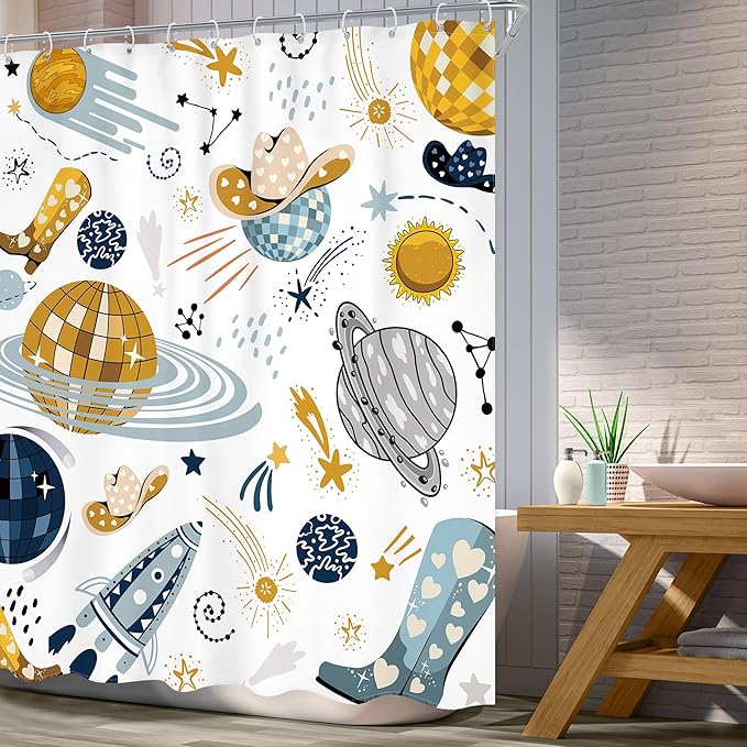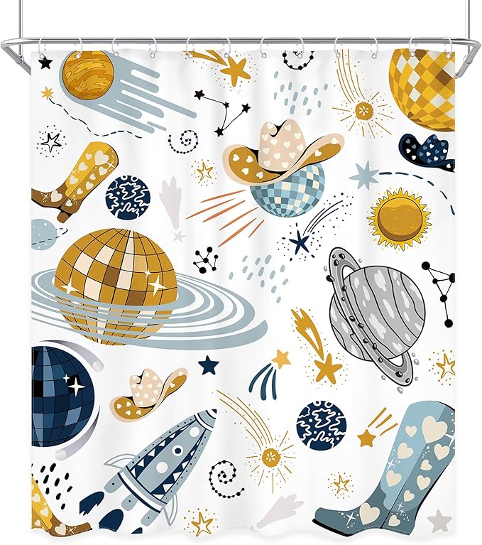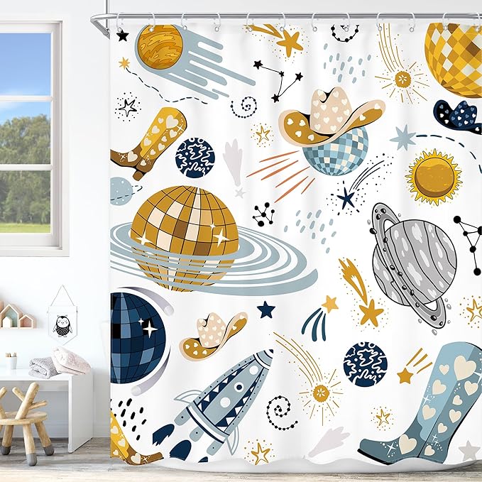 Kids Western Planet Shower Curtain 60Wx72L Inch Boy Disco Outer Space Retro Cool Cowgirl Cowboy Funny Galaxy Universe Wild West Bathroom Set Unique Bath Curtain Bathtub Accessories Home Decor