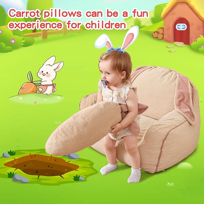- Toddler bean bag chair with carrot pillow: Used in conjunction with the rabbit toddler couch, it adds to the decor of the room. The carrot pillow is soft and cozy, suitable for children to cuddle and play, take a nap or read a book when leaning against it, cute and practical!