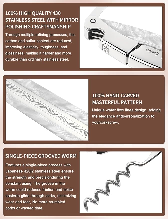 - HANDCRAFTED QUALITY & DESIGNED FOR COMFORT - Crafted from solid 430 stainless steel with a single-piece worm, the CORKAS wine opener is built to withstand years of use. The 100% manual assembly ensures exceptional quality you can depend on. The ergonomic, longer and moonstone resin handle with smooth edges is specifically designed for comfortable use, reducing hand fatigue during long shifts or frequent use at home. The polished metal finish adds a touch of sophistication to your wine service.