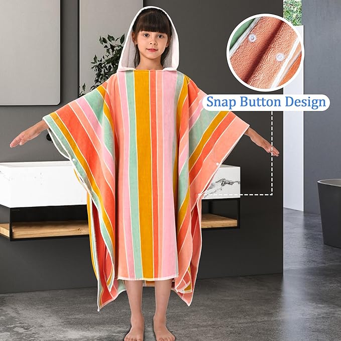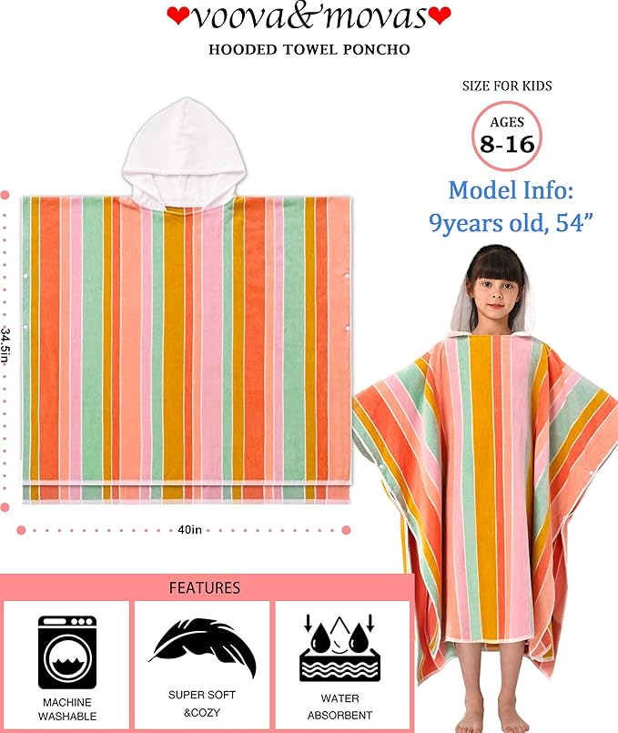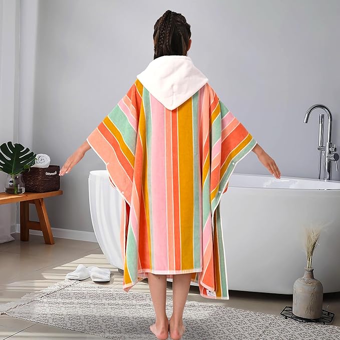 VOOVA & MOVAS Big Kids Hooded Poncho Towels for Teens (8-16Years), 100% Cotton Thick Poncho Towel, Perfect for Pool, Beach, Bath,Pink Blue Purple Stripe