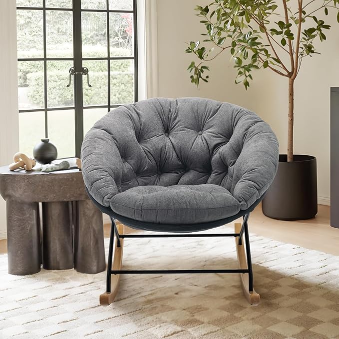 - 🍀 Egg Shaped Rocker with Superior Comfort: Our upholstered Papasan saucer rocking chair features a thick, plush, padded cushion that cradles you in comfort. The cushion's soft, tufted design ensures a cozy and relaxing experience every time you sit down.